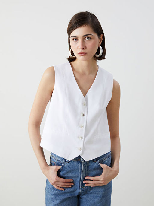 • V Yaka Keten Kar???ml? Kad?n Klasik Yelek