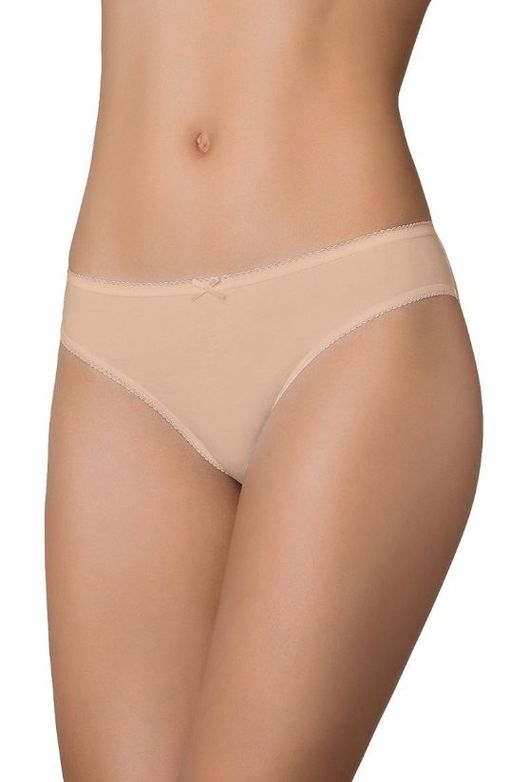 Женские хлопковые трусики слип Миними 221 из мягкого однородного трикотажного полотна с классической средней линией талии и стандартного размера бочком, обрамленные по контуру элегантной кружевной тесьмой, аккуратным бантиком спереди в качестве украшения и хлопковой гигиенической ластовицей.