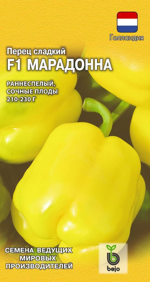 Перец незаменимый ингредиент свежих салатов, гарниров, подлив и заготовок впрок, богат невероятным количеством витаминов и аскорбиновой кислоты. F1 Марадонна гибрид белого, раннеспелого перца, одна из новейших разработок голландских селекционеров для теплиц и открытого грунта. Крупные (210-230 г), сладкие, необыкновенно вкусные плоды с сочными, толстыми стенками (6-8 мм) можно собирать уже через 98-107 дней от всходов. Растение мощное, высотой 80 см (в открытом грунте). Кубовидные перцы имеют привлекательную окраску, которая меняется при созревании от кремовой до желто-оранжевой. Посев на рассаду в марте. Глубина заделки семян до 1 см. Высадка рассады в мае. Пикировка в фазе 1-2-х настоящих листьев. После высадки у растения удаляют все боковые побеги и листья до первой развилки и подвязывают к опоре. Нельзя высаживать рассаду сладких и острых сортов перца рядом, т.к. происходит переопыление и сладкий перец приобретает горький вкус.