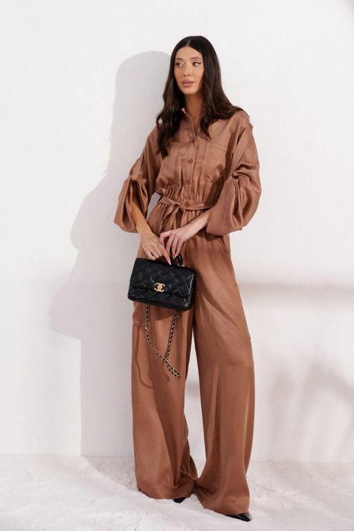 Комбинезон прямого кроя выполнен из ткани цвета песок.