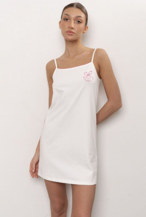 Сорочка на тонких регулируемых бретелях. Лиф сорочки декорирован контрастной строчкой мережка. Модель представлена в 4-х цветовых решениях. Карамель