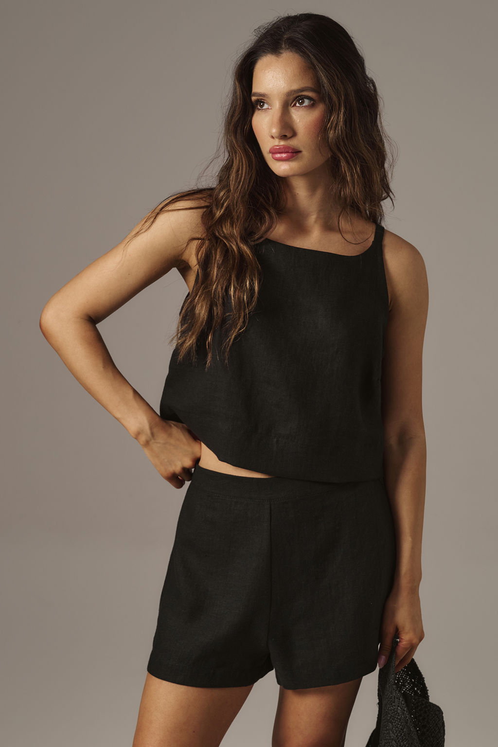 Льняной топ классического кроя на бретелях. Топ немного расклешен расклешен к низу, по бокам разрезы, посадка свободная.  Модель выполнена из 100% льна высокого качества. онкий длинноволокнистый лен особенно прочный, отлично пропускает воздух и впитывает влагу, что делает его идеальным выбором для гардероба. Сделано в России на собственном производстве.­