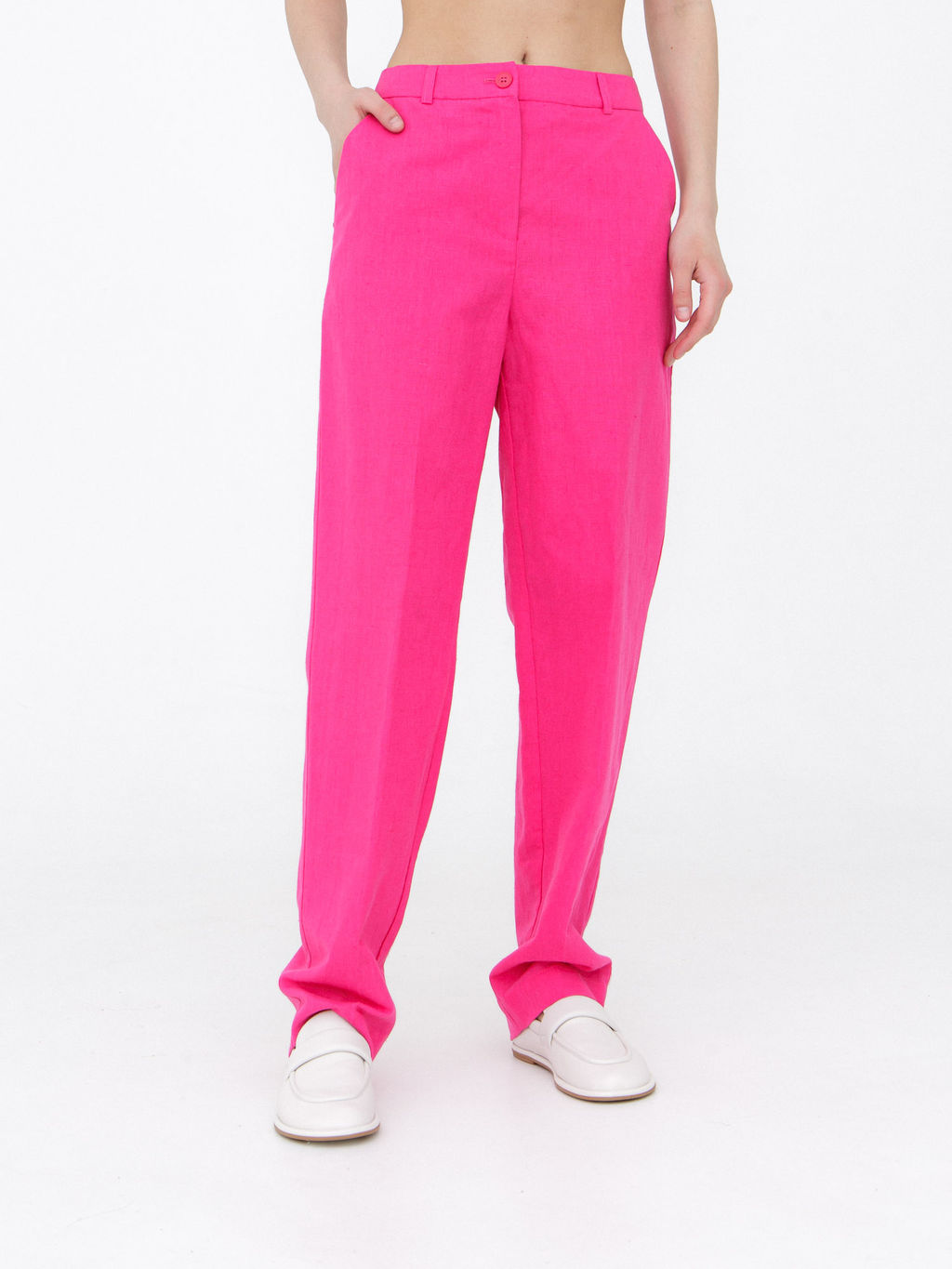 Яркий цвет фуксии добавляет вашему образу энергичности и выразительности, делая эти брюки ключевым элементом летнего гардероба. Они безупречно сочетаются со светлыми блузами и топами для создания контрастного образа или с однотонными вещами нейтральных оттенков для более сдержанного ансамбля.