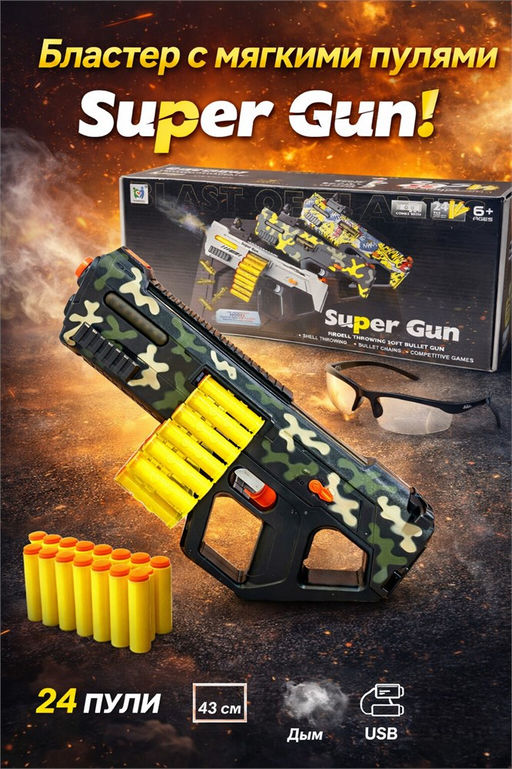 • Стреляющ. мягкими пулями аккумул. 43*18см бластер (202B) 24пули в гильзах из ABC-пласт., очки, USB; дым из ствола, возм. ручная стрельба, 2-е бегущие огни, выброс гильз