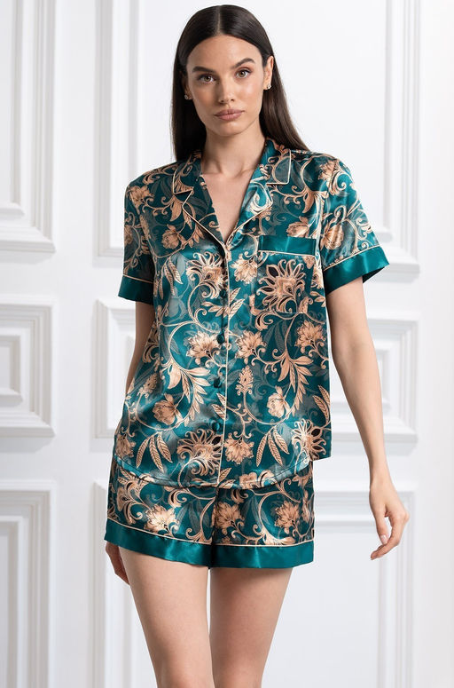 Комплект Mia-Amore состоит из жакета с коротким рукавом и шорт. Выполнен из принтованного смесового шелка с однотонной отделкой и контрастным кантом. По бокам шорт расположены карманы. Состав:70% натуральный шелк, 25% полиэстер, 5% эластан