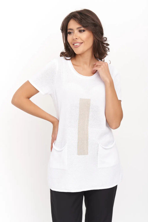 Женский трикотажный джемпер свободного силуэта. Рукав втачной,короткий, вырез горловины круглый. Джемпер выполнен  структурным кулирным переплетением. Два накладных вывязанных кармана.­