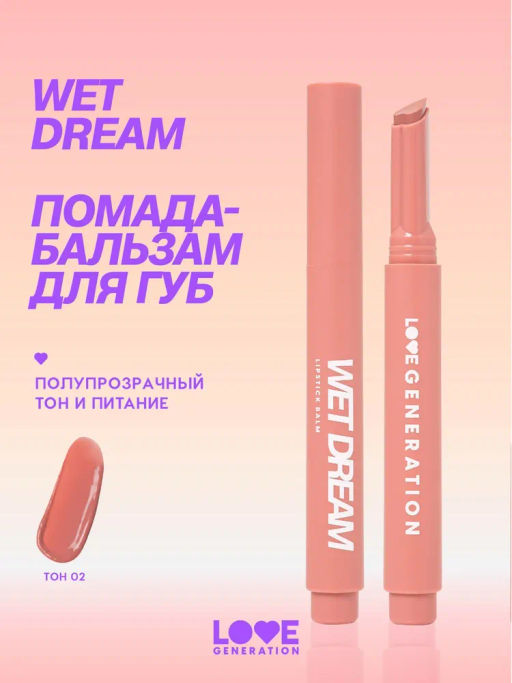Love Generation Помада-бальзам "Wet Dream" тон 02 sugar rush - розово-персиковый, 1,4 г
