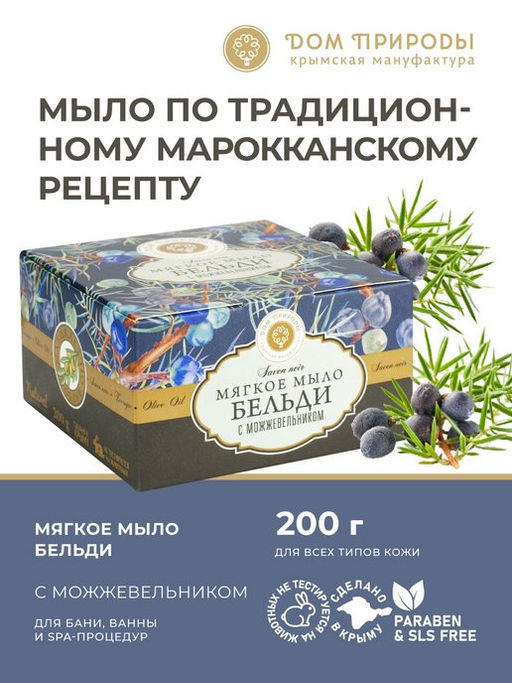 омыленные растительные масла (кокосовое, виноградных косточек, касторовое), подготовленная вода, кокоглюкозид, масло лавра, бело-голубая глина, молотые ягоды можжевельника, экстракт хвои, глицерин, кислоты янтарная, лимонная, эфирные масла можжевельника, розмарина, сандала, иланг-иланга, экстракт аннато, бензоат натрия.
