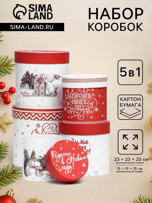 • Набор шляпных новогодних коробок 5 в 1 «Зима время чудес», 23×23 — 15×15 см