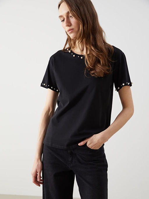 • Bisiklet Yaka Boncuk ??lemeli Kad?n Ti??rt