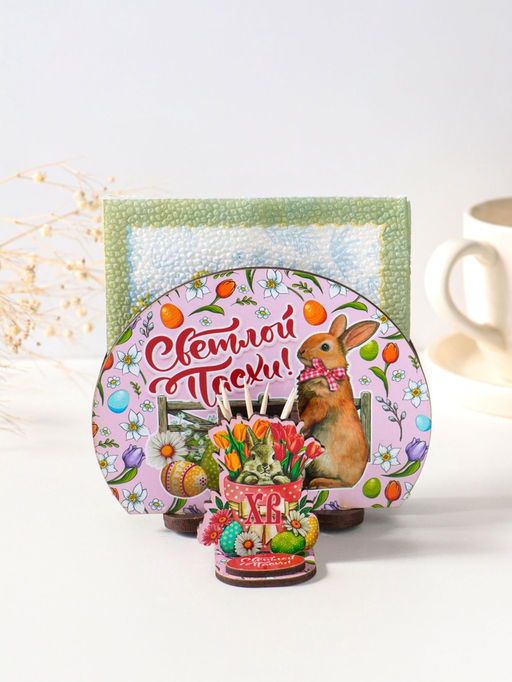 Этот пасхальный набор из двух предметов станет ярким акцентом весеннего стола. Фигурная салфетница и подставка для зубочисток с изображением зайчика создают целостную и трогательную композицию. Изделия выполнены из плотного ХДФ с нежным розовым рисунком, что делает их одновременно праздничными и уютными. Набор идеально подходит для сервировки пасхального завтрака, создания тематического декора или в качестве душевного подарка к празднику. Особенности набора * В комплекте два предмета для сервировки. * Материал изготовления качественная древесноволокнистая плита. * Поверхность украшена тематическим рисунком в нежной палитре. * Тематика оформления посвящена животному миру. * Для сохранения внешнего вида рекомендуется бережный ручной уход. Создайте праздничное настроение Такой комплект помогает легко и красиво организовать пасхальные угощения. Салфетница аккуратно держит бумажные салфетки, а фигурная подставка превращает обычные зубочистки в элемент декора. Композиция поддерживает весеннюю и домашнюю атмосферу, добавляя столу тепла и внимания к деталям. Практичное и стильное решение для встречи светлого праздника в кругу семьи. Дополнительно Размер салфетницы: 10x12.8x5 см. Размер подставки под зубочистки: 3.7x3.7x6.5 см.