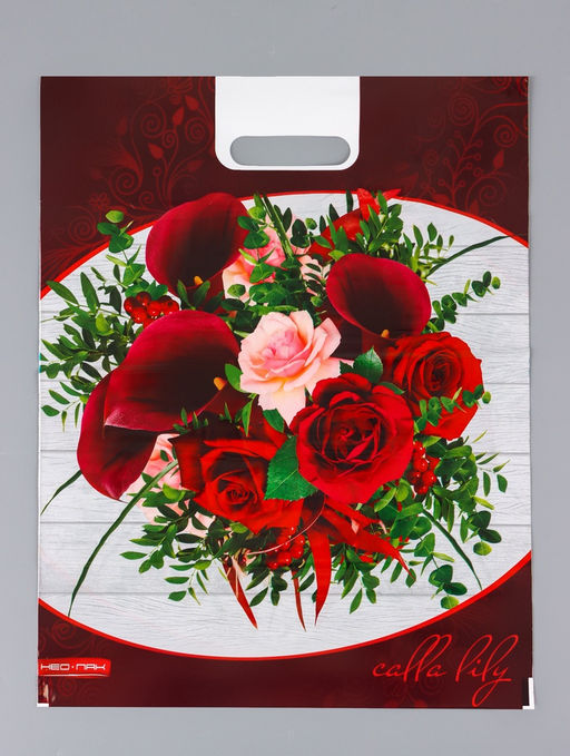 * Дизайн с акцентом на благородный цвет: Бордовый глубокий и сложный оттенок, который ассоциируется с элегантностью и вкусом. Изображение калл, известных своей графичной формой, усиливает это впечатление. Пакет подходит для подарка женщине, где важен намёк на утончённость.