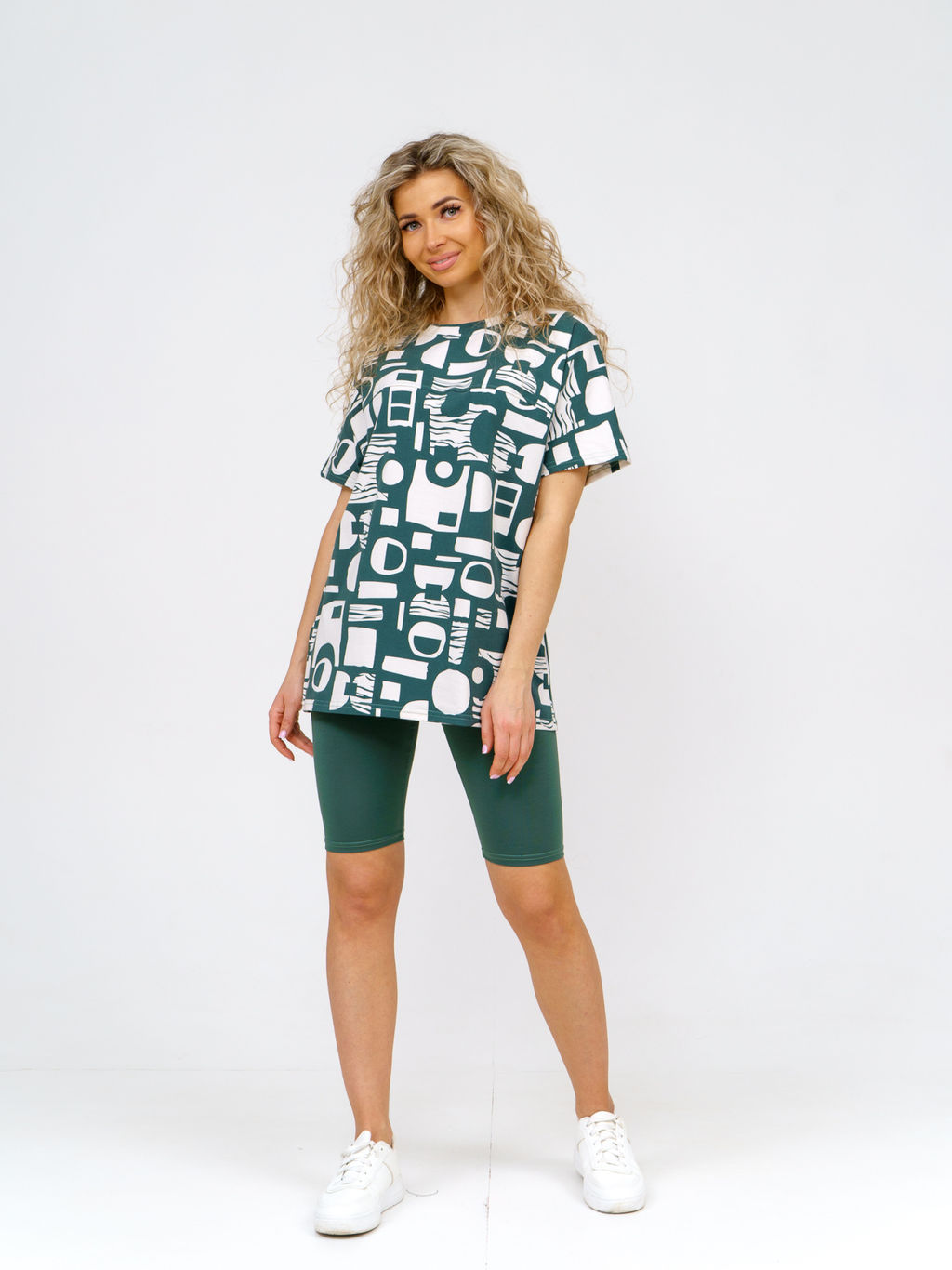 Стильный женский костюм двойка в стиле спорт-шик идеальное сочетание комфорта, уюта и модного дизайна. Этот трикотажный комплект состоит из длинной футболки оверсайз с ярким принтом и облегающих шорт-велосипедок, которые вместе создают гармоничный и женственный образ. Футболка свободного кроя с коротким рукавом и стильными разрезами по бокам идеально сочетается с велосипедками на эластичной резинке, которые мягко облегают фигуру, подчеркивая все преимущества силуэта. Высококачественное трикотажное полотно приятно к телу, обеспечивает комфорт и тепло в прохладную погоду, оставаясь легким и дышащим в теплое время года это действительно универсальный комплект, для которого смена сезонов не имеет значения.