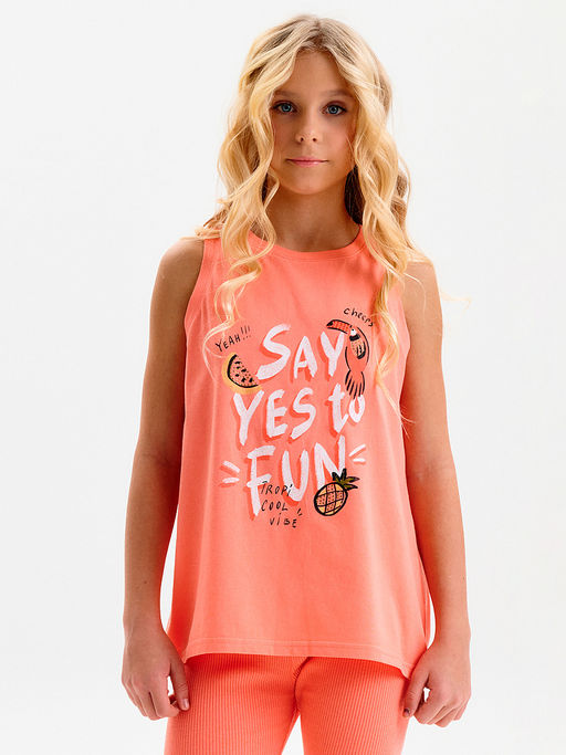 Майка для девочки. Выполнена из мягкого трикотажного полотна. Свободный трапециевидный силуэт с лёгким перепадом по низу делает модель удобной и не сковывает движения. Горловина и проймы аккуратно обработаны эластичной рибаной в тон ткани. Перевод: СКАЖИ ДА ВЕСЕЛЬЮ; ДА!!! УРА; ТРОПИКУЛ(ИГРА СЛОВ) ВАЙБ.