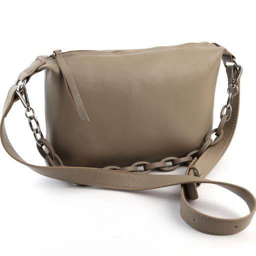 Женская из натуральной качественной кожи цвета хаки с съемной, декоративной цепью. Закрывается на молнию. Внутри одно отделение и боковые кармашки, два на молнии и два открытых. Снаружи, на задней стенке карман на молнии. Сумка имеет регулируемый по длине наплечный ремешок.­