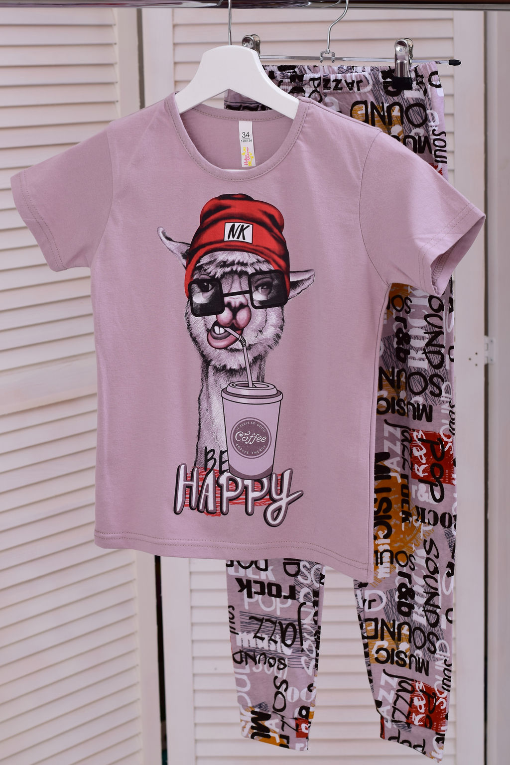 Пижма состоит из футболки с коротким рукавом, на полочке забавный принт Лама. Брюки на резинке, заужены к низу на манжете. Длина футболки по спинке: 30-43 см, 32-46 см, 34-49 см. Длина брюк по боковому шву: 30-64 см, 32-72 см, 34-80 см. Длина брюк по шаговому шву: 30-42 см, 32-49 см, 34-57 см.