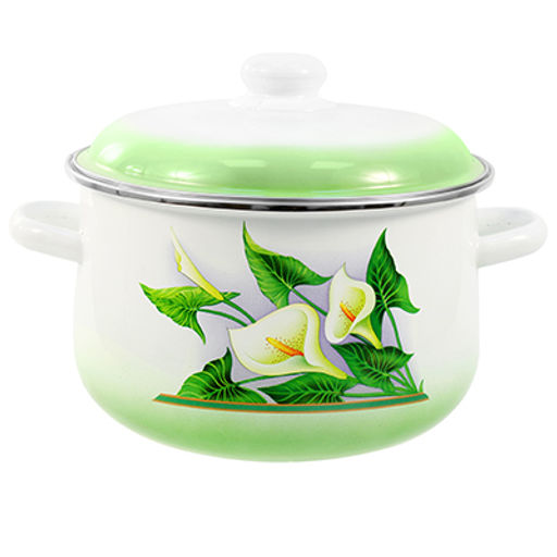 • "Каллы" Кастрюля эмалированная 4л, д22см, h13см, коническая форма, металлическая крышка с пластмассовой ручкой-кнопкой, ободок из нержавеющей стали, белый с подпылением (Россия)