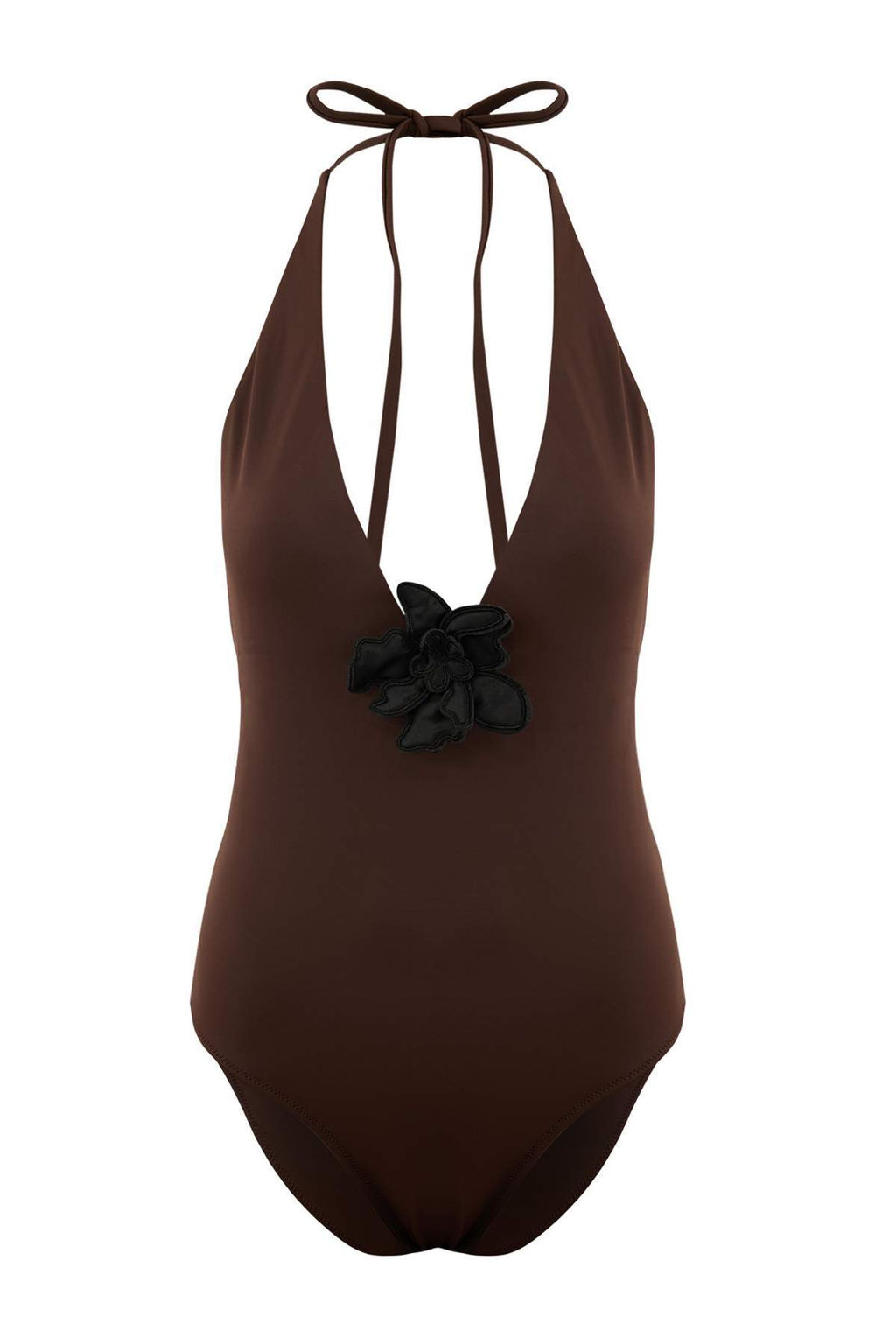 • Kahverengi Derin V Yaka Kapl? Cicek Aplikeli Regular Mayo TBESS26MA00022