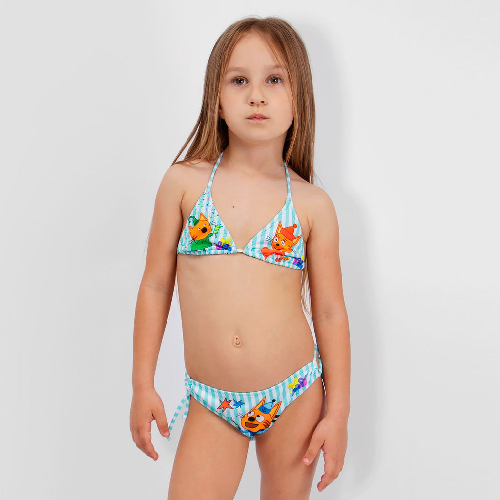 Раздельный купальник, с модным принтом, для девочки. Выполнен из эластичного материала, не выгорает на солнце, быстро сохнет и не теряет своей первоначальной формы. Лиф и трусики с завязками. Замечательный выбор для летнего отдыха.