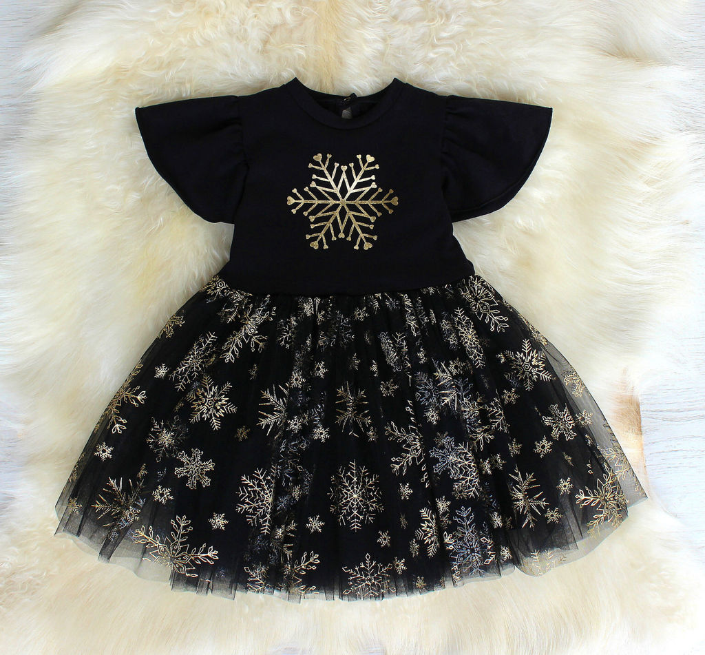 Платье детское из футера 2-х нитки с фатиновой юбкой, украшенной блестящими снежинками. ВНИМАНИЕ: снежинки на юбке выполнены из глиттера, особенностью которого является частичное осыпание блёсток!