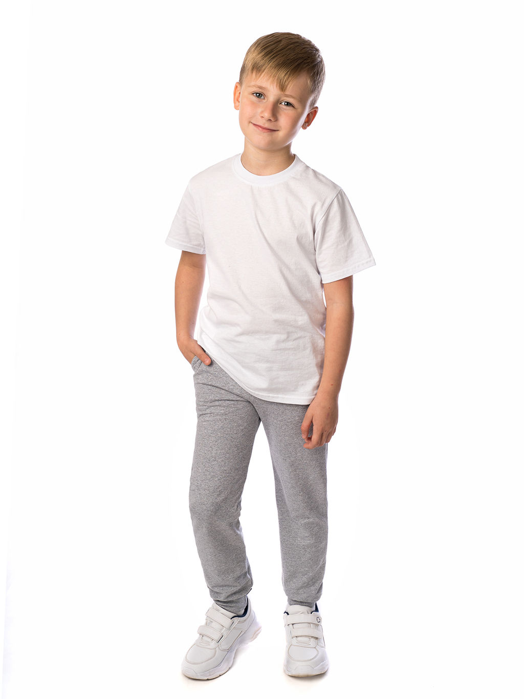 Трикотажные брюки серого меланжевого цвета свободного кроя пригодятся ребёнку для активных прогулок или занятий спортом. Модель выпускается из практичного и нежного на ощупь футера с добавлением лайкры. Брюки имеют глубокие карманы по бокам, широкий пояс, шнур для утяжки по размеру, манжеты внизу штанин.
