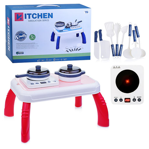 - плита (16.5х19.5х3.5 см.) - сенсорные кнопки, световые эффекты, звуки готовки, при включении играет детская песенка на английском языке, голосове сопровождение (иностранный язык).