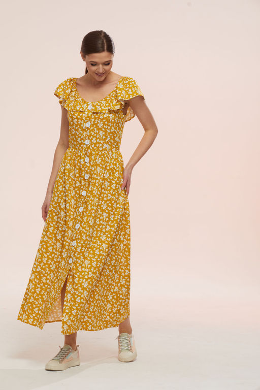 Летний, стильный, красивый сарафан без подкладки. Облегающий лиф и присборенная нижняя часть сарафана удачно контрастируют друг с другом. По переду лифа сарафана безпритачные бочки, спинка со средним швом и талевыми вытачками. По центру переда сарафана притачные планки на функциональную застёжку петли-пуговицы. По верху лифа сарафана волан-пелерина, переходящий от центра переда на плечи и спинку. На плечевом уровне настрочена эластичная тесьма-резинка, создающая эффект сборки. Пуговицы могут отличаться от заявленных на фото. В боковых швах нижней части сарафана боковые функциональные карманы. Горловина переда и спинки, проймы- обработаны обтачками. Шикарная посадка по фигуре. Длина сарафана от уровня линии талии 90,5см. Цвет сарафана может отличаться на полутон от заявленного на фото.­