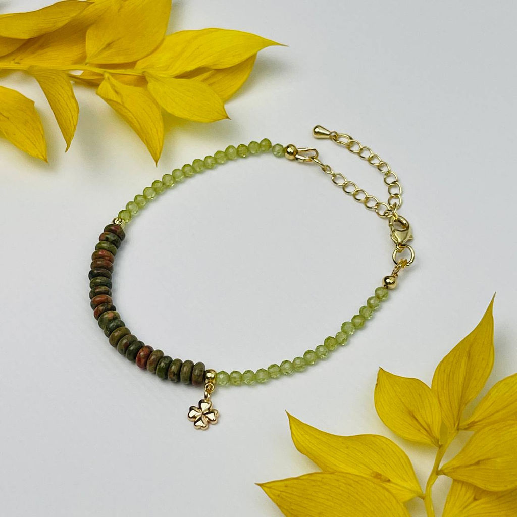 • Браслет из Хризолита и Унакита с подвеской "Клевер"