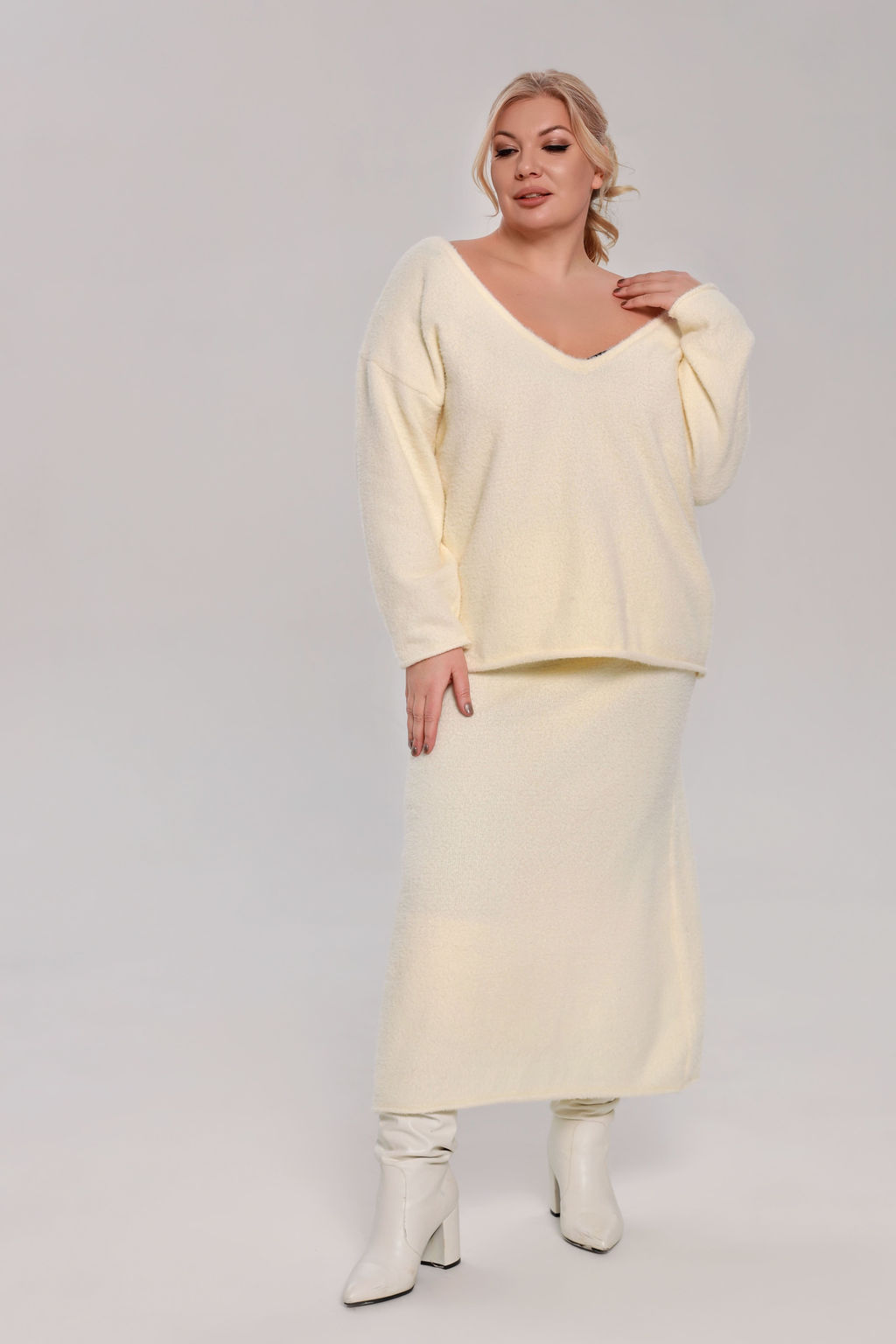 Теплый женский костюм идеальный выбор для зимы и межсезонья изготовлен из мягкой пушистой ткани "травка". Вязаный комплект состоит из джемпера оверсайз и юбки, создавая стильный и комфортный образ. Джемпер можно носить как с круглым вырезом спереди, так и  с V-вырезом. Имеет приспущенные рукава полной длины.  Юбка трапеция с высокой посадкой на резинке искусно обыгрывает бедра. Этот трикотажный лук подходит как для прогулок, так и для офиса. Костюм-двойка прекрасно сохраняет тепло, обеспечивая комфорт даже в самые холодные дни. Шерстяной костюм кэжуал отлично садится по фигуре, не сковывает движения и дарит ощущение уюта. Удобная и практичная модель станет незаменимой вещью в вашем гардеробе.­