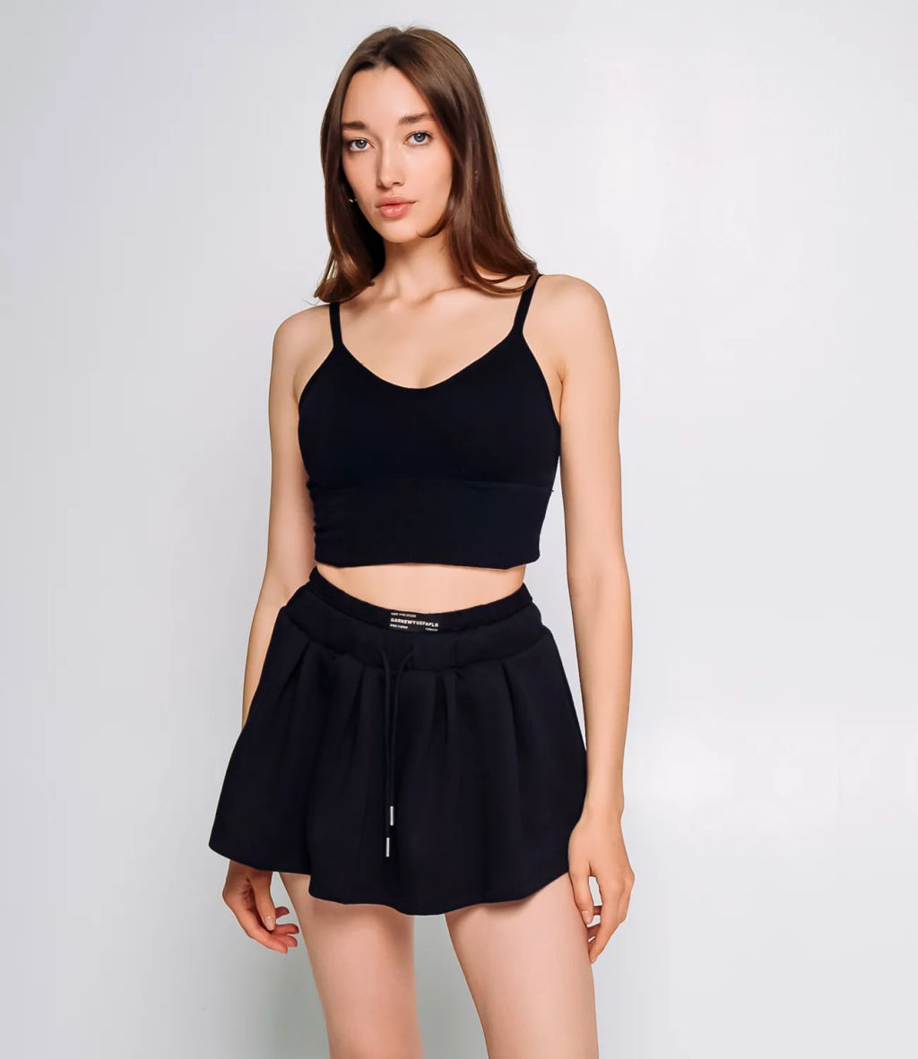Юбка выполнена из ткани, состоящей из 85% хлопка и 15% полиэстера, что придаёт изделию мягкость и натуральность хлопка с добавлением прочности и легкой эластичности за счет полиэстера. Юбка свободно расширяется книзу. Талия оформлена широкой, эластичной резинкой с внутренним широким вставным поясом из прозрачного материала с декоративным узором, что обеспечивает удобство посадки по фигуре и добавляет необычный дизайнерский акцент. Спереди находится шнурок, оформленный в форме завязок, позволяющий дополнительно регулировать посадку на талии и служащий стильным декоративным элементом. Концы шнурка дополнены металлическими наконечниками для придания аккуратного вида. Ткань хорошо драпируется и сохраняет форму, благодаря плотной структуре и высокому содержанию хлопка. Длина юбки короткая, акцентирующая ноги и создающая свежий, молодежный, и в то же время комфортный образ. Такая юбка отлично подходит для повседневной носки и может объединяться с различными верхами и обувью, создавая стильные и удобные комплекты. Рост 168, 85-63-92.­