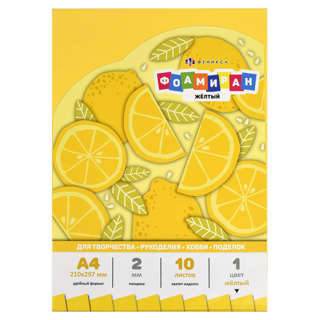 Фоамиран А4, арт. 65987 / 20 ЖЕЛТЫЙ (размер 210х297 мм, 10 лист/-ов, 1 цвет/-ов, флат-листы из ЭВА толщиной 2 мм; обложка: обложка-вкладыш, мелованная бумага 115 г/м?, полноцветная печать; индивидуальная упаковка: ПЭТ-пакет с европодвесом)