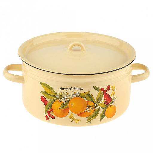 • "Фруктовая фантазия" Кастрюля эмалированная 5,5л, форма цилиндрическая, металлическая крышка, металлические ручки, кремовый (Россия)
