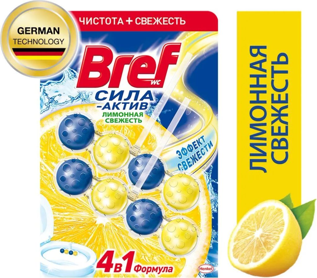 - Средство Бреф содержит шарики желтого и синего цвета. При каждом смывании воздух наполняется одновременно ароматом лимона и свежестью, благодаря двойной силе шариков для унитаза Bref. Поэтому нет необходимости пользоваться дополнительными освежителями воздуха в туалете.
