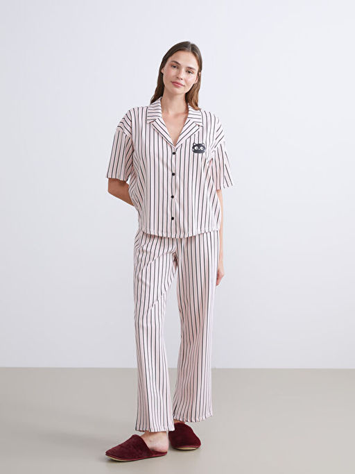 G?mlek Yaka ?izgili Kad?n Pijama Tak?m