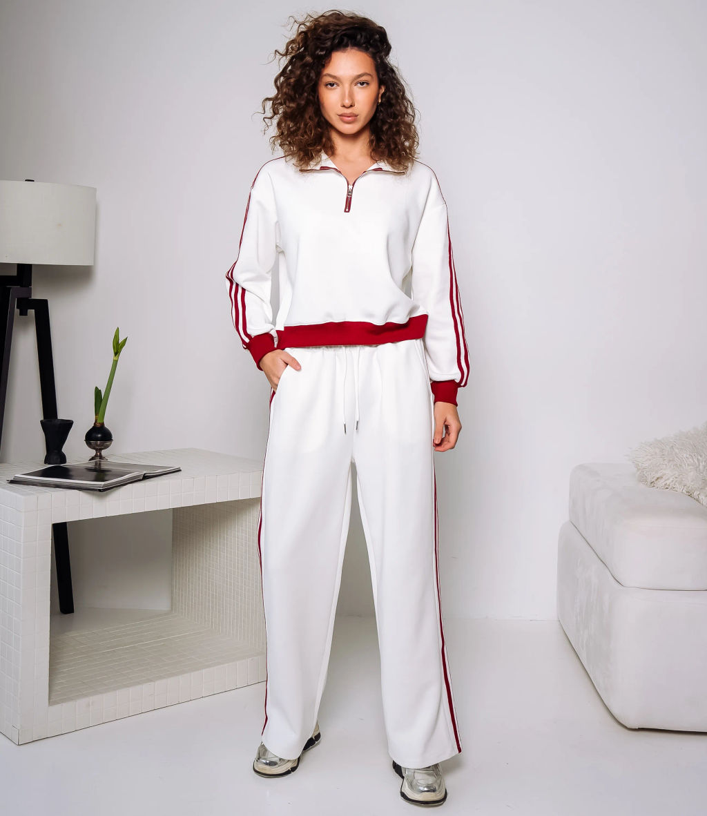 Спортивный костюм это одежда, которая подчеркивает стиль и комфорт каждой женщины. Укороченная толстовка с воротником-стойкой и короткой центральной молнией, линия плеча опущенная, рукава длинные с манжетами из рубчика; по внешней стороне рукавов декоративные продольные тесьмы, низ талии завершён широким резиновым кантом с эластичной втяжкой, внутренние плоские швы. Брюки прямого, свободного кроя со средней или слегка высокой посадкой, широкий эластичный пояс с наружным шнурком. Для изготовления использованы ткани 95% хлопок и 5% спандекс, который характеризуются отличным качеством и дышащими свойствами. Даже после множества стирок изделие не утратит первоначальной красоты. Вы будете носить его с радостью. Обратите внимание на цвет. Он полностью соответствуют фотографии на сайте. Чтобы вы были уверены в размере, мы представили на странице таблицу. Воспользовавшись ею, вы сможете сами обмерить себя и удостовериться. Установленная нами цена является приемлемой. Не откажите себе в удовольствии быть стильной и комфортной! -- Характеристики -- Цвет: белый Пол: Женский Страна производитель: Корея Сезон: Демисезон Материал: Хлопок, Спандекс