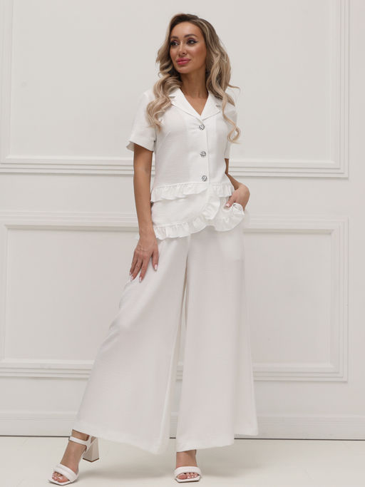 Роскошный костюм прямого силуэта из текстильной ткани синего цвета. Костюм состоит из жакета и брюк. Жакет с отложным воротником, по планке переда выполнена застежка на пуговицы. Перед жакета дополнен оборками. Верхняя часть брюк обработана поясом с резинкой. Длина жакета по спинке от плечевого шва до низа изделия 62 см. Длина брюк от пояса до низа изделия 95 см. Рост фотомодели 170 см.