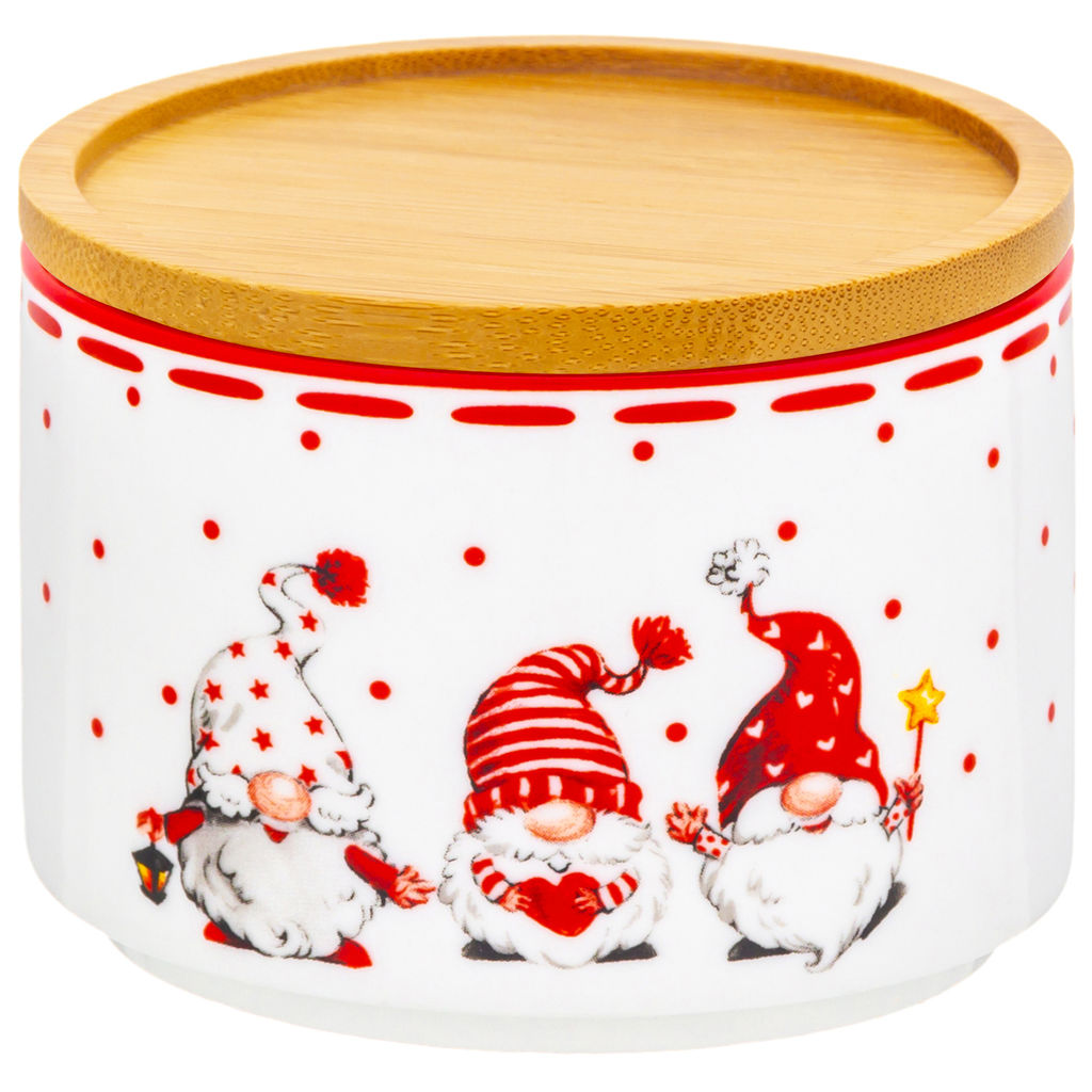 Банка д/хранения 250 мл 9,3*9,3*7 см "Весёлые гномики" + дер. крышка-подставка с крыш. с сил. уплот.