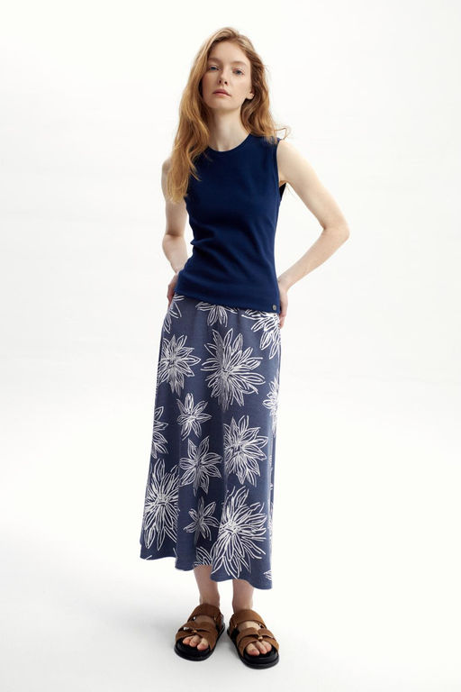 Удлиненная юбка расклешенного силуэта, изготовленная из премиального трикотажного полотна DOUBLE FACE. Мягкий на ощупь трикотаж выполнен из высококачественной гребенной пряжи, а его дизайн добавляет летнего настроения. Подберите летний образ, добавив блузу из этой коллекции.. Состав: 76% хлопок, 24% полиэстер