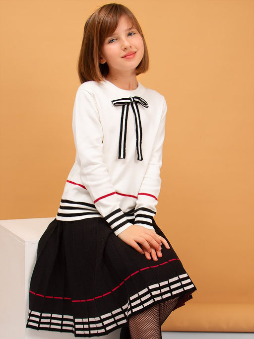 Тёплый костюм для девочки. Кофта и юбка выполнены из трикотажа плотной вязки, декорированы трендовым рисунком. Кофта дополнена съёмной брошью. Стильный образ для посещения школы, официального или праздничного мероприятия.