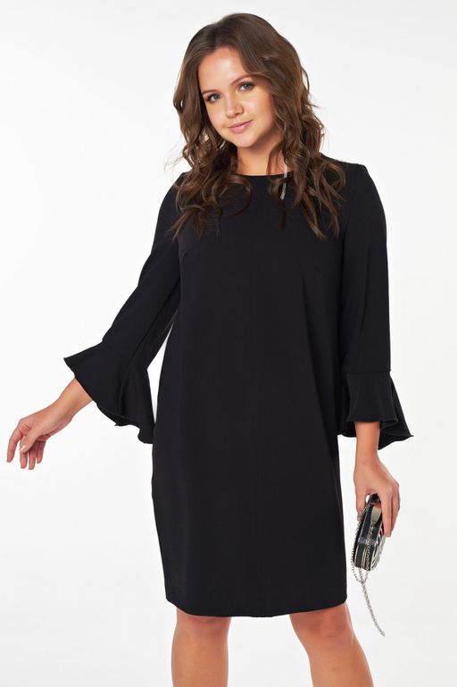 Особенности: Платье из плотной плательной ткани с декоративными воланами по рукавам. Детали: горловина округлой формы с отстрочкой, вертикальное членение по переду, вытачки, застежка по спинке на потайную молнию. Рукав 3/4 с притачным асимметричным воланом по низу.