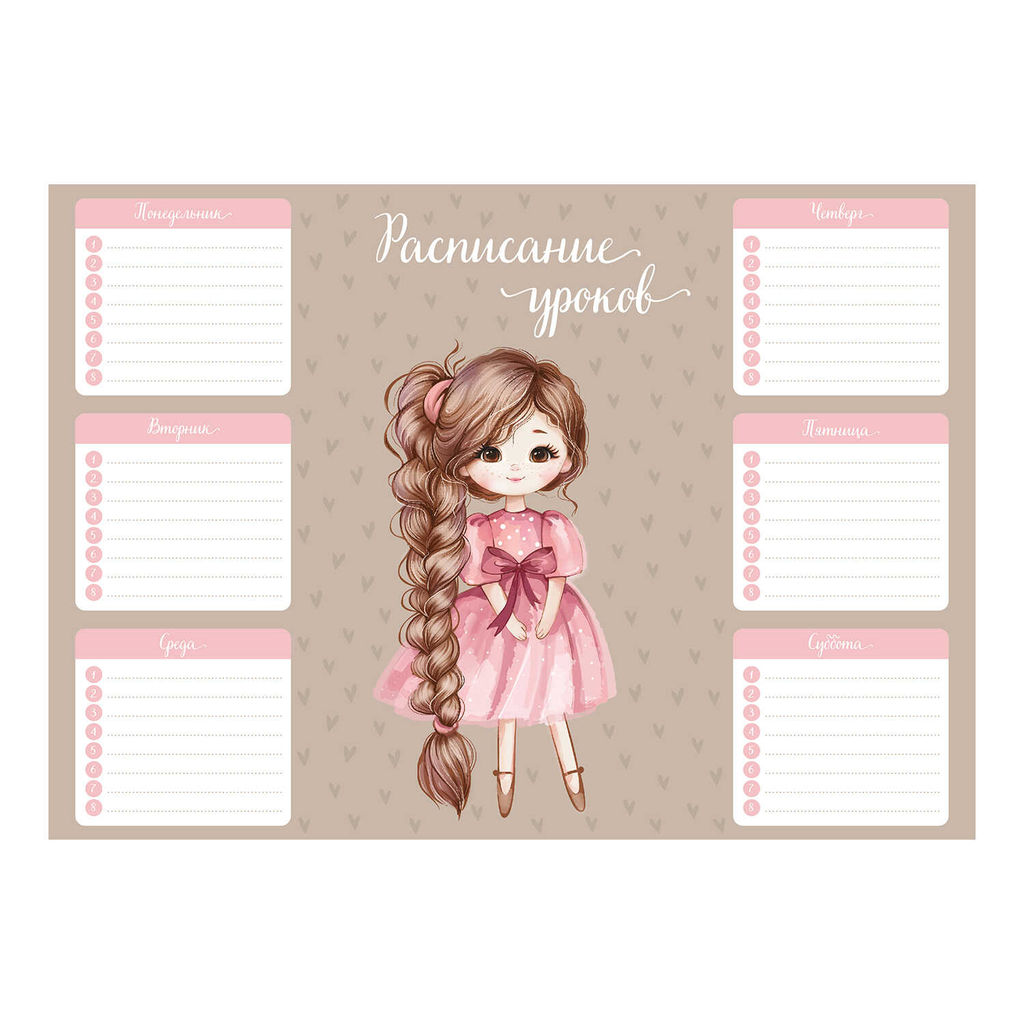 Расписание уроков А4, арт. 72586/ 50 ДЕВОЧКА С КОСОЙ (210x297 мм, материал: мелованный картон 235 г/м?, полноцветная печать, декор: выборочный УФ-лак; индивидуальная упаковка: нет)