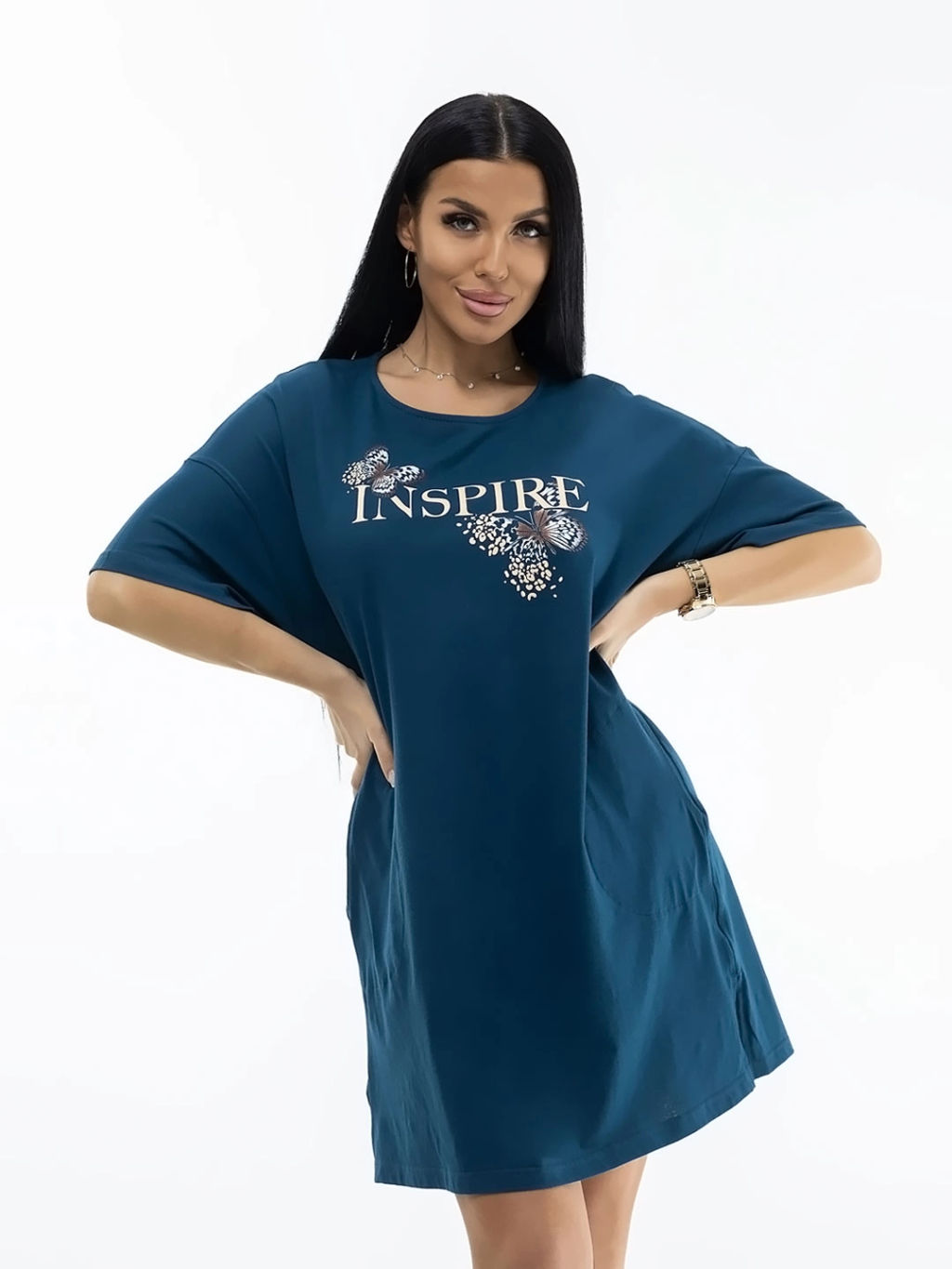 Туника женская из мягкого, приятного к телу трикотажного полотна, длиной выше уровня колена. Домашнее платье имеет округлый вырез и стильный спущенный рукав. В боковых швах удобные вырезы. На полочке и спине красивый печатный рисунок.­