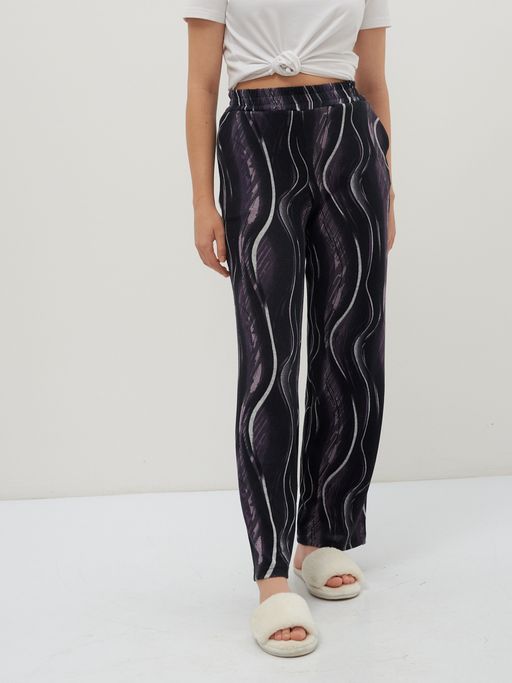 Прямые, свободные домашние брюки из мягкого трикотажного полотна с высокой посадкой и карманами с боковым срезом. Брючки предназначены для сна и домашнего отдыха. На модели размер изделия 42. Рост модели 175 см. Машинная деликатная стирка.­
