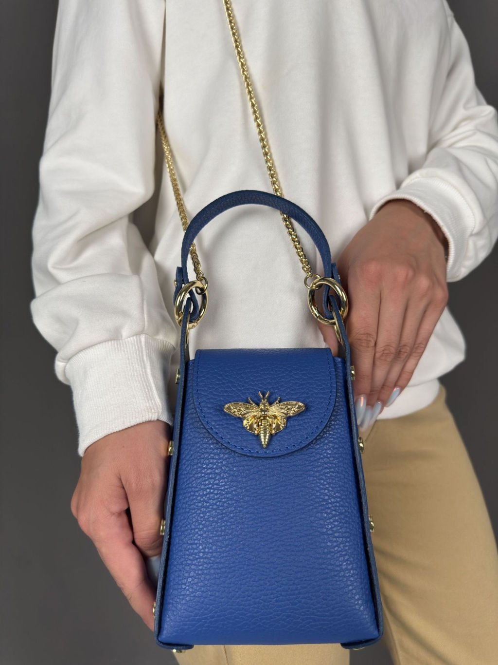 Страна: Италия Акции: Товары со скидкой Производитель: Pelletteria Luisa, Italy Размер: маленькая Стиль ношения: на ремешке через плечо Форма: жесткая Выделка кожи: зернистая износостойкая Цвет кожи: Синий Оттенок: ярко-синий Палитра цветов: TB-105944 Dollaro Размеры: длина: 13 см \tвысота: 21 см \tширина: 6 см Описание: Красивая аккуратная необыкновенно модная женская сумка кросс-боди из натуральной кожи. Тренд 2024 года, Базовая коллекция Sefaro, Италия. Особенности сумки: замок в виде золотой бабочки, плечевой ремень-цепочка, а также заклепки на боковых стенках сумки - фурнитура высокого итальянского качества. Все эти элементы непременно привлекут к вам внимание окружающих своей яркостью и оригинальностью исполнения. Сумочка имеет каркасную форму, компактная, выполнена из зернистой телячьей кожи, может использоваться как повседневная модель, но подойдет и для торжественного случая - элегантно дополнит вечерний образ по типу клатча, либо подчеркнет сдержанный лук. Закрывается сумка на крышку с застежкой, внутри один отдел, в котором поместится всё самое необходимое. На дне сумки металлические защитные ножки. Можно носить в руке, либо на изящной цепочке через плечо (длина 110см) - очень удобно!