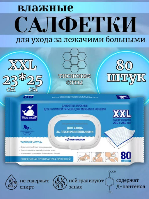Влажные салфетки с Д-пантенолом White Whale XXL предназначены для ухода за нежной кожей лежачих больных и новорожденных. Важные полотенца для лежачих больных незаменимы для быстрого и удобного очищения кожи без использования воды и моющих средств а благодаря клапану, предотвращает высыхание салфеток.