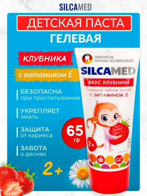Зубная паста детская с фтором Silcamed 65 г. Нежная гелевая со вкусом клубники разработана специально для детей раннего возраста от 2-х лет. Она содержит активный кальций, который помогает укрепить молочные зубки и предотвратить их разрушение. Формирует крепкую эмаль и защищает от кариеса! Экстракты ромашки и шалфея устраняют дискомфорт и зуд дёсен при прорезывании. Витамин Е бережно ухаживает за полостью рта. Снижает образование налёта и камня, способствует предупреждению проблем с дёснами. Безопасна при случайном проглатывании! Она идеально подходит для деток от 2 лет и станет надёжным помощником в формировании правильной и регулярной гигиены. Продукт имеет гелевую текстуру, лёгкий запах лесной клубнички и розовый цвет, чтобы сделать чистку ещё более приятной для вашего ребёнка. К тому же, благодаря уникальной формуле, зубы будут белоснежными и красивыми. Производители учли потребности малышей с чувствительной кожей. Может использоваться при ношении брекетов, ортодонтических систем по согласованию со стоматологом. Не тестируется на животных. Мы уверены, что вы полюбите её качество, а ваш малютка будет с удовольствием использовать её каждый день. Силкамед. Внешний вид товара может отличаться от представленного изображения, при выборе ориентируйтесь на название товара