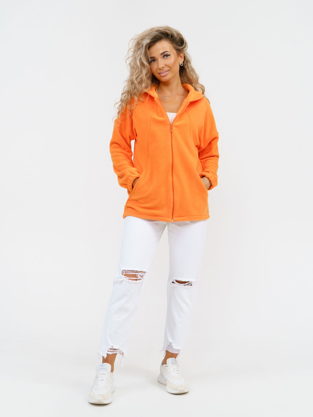 Женская толстовка на молнии из мягкого флиса с антипиллинговым покрытием идеальный выбор для холодного времени года. Эта теплая олимпийка с капюшоном изготовлена из высококачественного микрофлиса, который обеспечивает комфорт, уют и отличную терморегуляцию. Модель отличается легкостью, практичностью и свободным кроем, не сковывающим движения, что делает ее популярной среди любителей активного отдыха, охоты и рыбалки. Благодаря втачным рукавам и оверсайз дизайну толстовка удобна в носке как для повседневных образов, так и для спортивных тренировок. Флисовый материал обладает высокой воздухопроницаемостью, практически не впитывает влагу и сохраняет тепло даже в прохладную погоду. Гипоаллергенная ткань приятна к телу, а стойка воротника надежно защищает от холодного ветра. Стильные карманы и рельефные детали на полочках добавляют образу современности и уникальности. Удлиненный крой и свободный силуэт делают эту модель универсальной для любого типа фигуры. Молния позволяет регулировать степень открытия горловины. Капюшон дополнен кулиской для дополнительной защиты от непогоды. Эта флисовая худи must-have в гардеробе современной девушки, которая ценит комфорт, практичность и стиль. Отличное сочетание функциональности и модного дизайна . Быстро сохнет, не требует особого ухода, сохраняет форму после множества стирок. Идеально подходит для прогулок, занятий спортом, путешествий и повседневной носки.