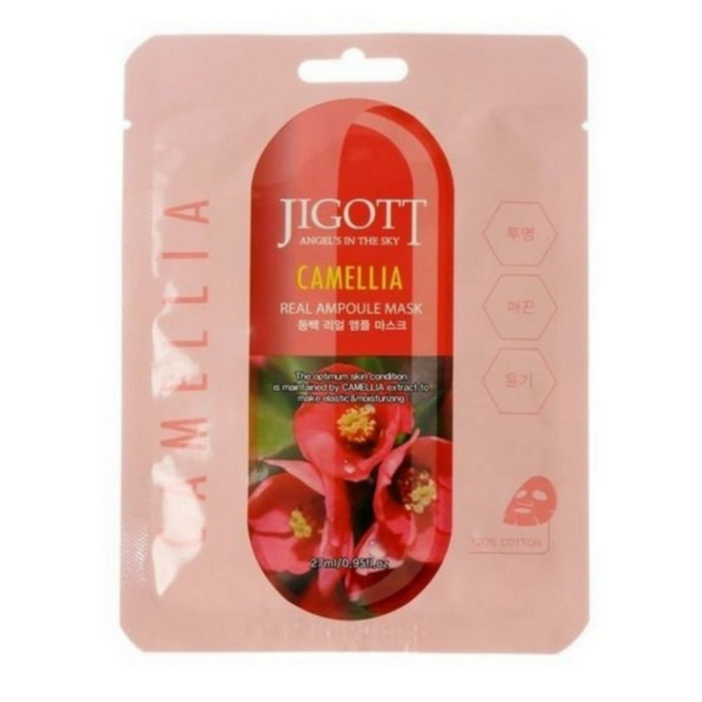 Маска с камелией Jigott Camellia Real Ampoule Mask увлажняет кожу и предупреждает потерю влаги, снимает шелушения и раздражения, способствует осветлению пигментации и выравниванию тона кожи, защищает от негативного воздействия окружающей среды и замедляет процессы старения.