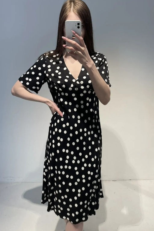 Платье из вискозной ткани полуприлегающего силуэта, расширенное книзу. Крой платья-по косой. На передней части изделия выполнен фигурный подрез в области груди, со сборкой. V-образный вырез горловины. Втачной короткий рукав.