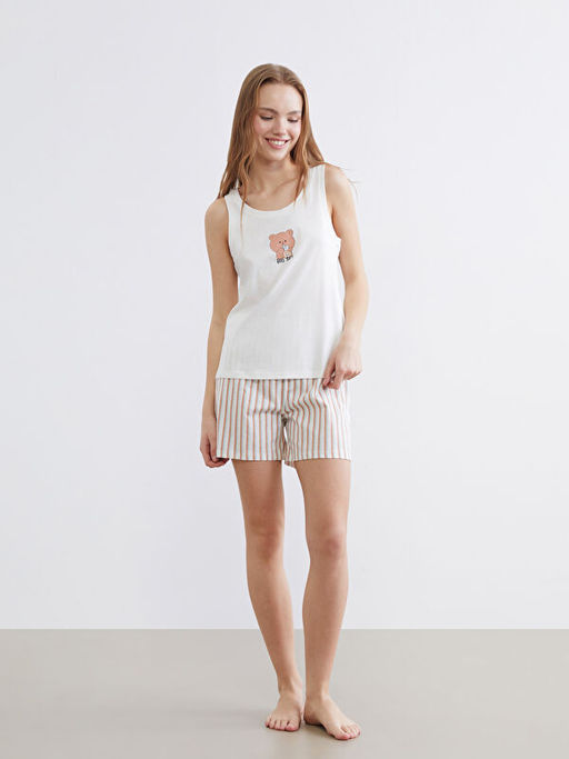• U Yaka Bask?l? Kad?n ?ortlu Pijama Tak?m?
